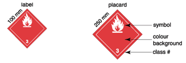 - Placardlar büyük taşıma birimleri ve araçlar için kullanılır ve daha büyük sembollerle tehlikeli maddenin sınıfını, tehlikelerini ve UN numarasını gösterir.